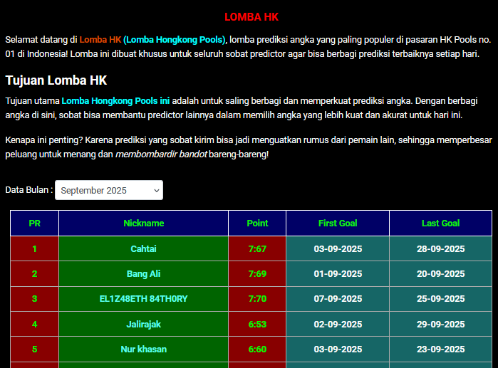 Selamat datang di Lomba HK (Lomba Hongkong Pools), lomba prediksi angka yang paling populer di pasaran HK Pools no. 01 di Indonesia! Lomba ini dibuat khusus untuk seluruh sobat predictor agar bisa berbagi prediksi terbaiknya setiap hari.