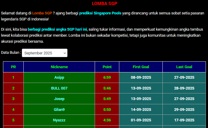 Lomba SGP adalah forum prediksi angka Singapore Pools yang terbuka untuk semua. Tujuan utama dari lomba ini adalah: